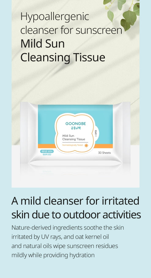 GOONGBE Mild Sun Cleansing Tissue is a travel-friendly sunscreen-removal wipe designed for delicate and sensitive skin. Each single wipe gently dissolves and lifts away sunscreen and outdoor residues with a mild formulation enriched with nature-derived soothing ingredients and oat kernel oil, helping calm skin irritated by UV exposure while leaving a soft, clean finish. Packaged as 3 convenient sets of 30 sheets, these cleansing tissues are ideal for quick post-outdoor refreshes and on-the-go skincare routines.
