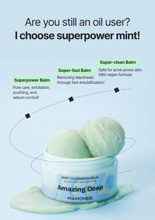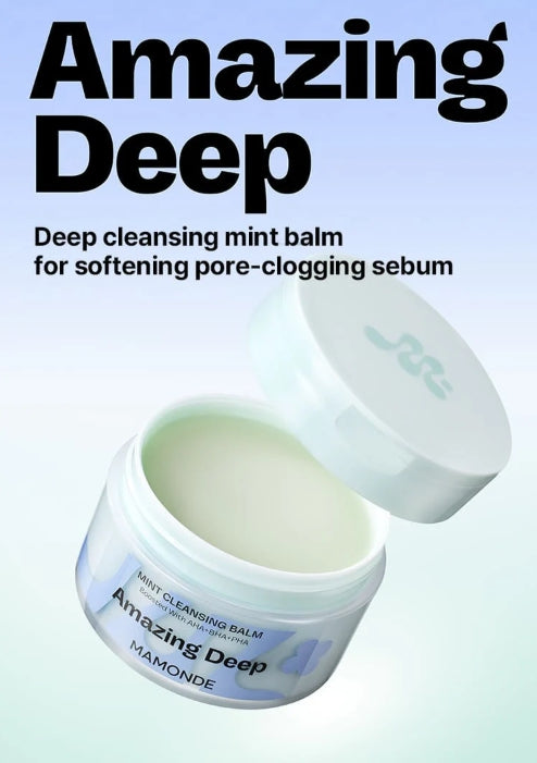 Mamonde Amazing Deep Mint Cleansing Balm is a mint-infused, hypoallergenic cleansing balm that transforms from a solid balm into a silky oil to dissolve heavy makeup, sunscreen and excess sebum while helping to soothe skin and refine pores. Formulated with a Triple Mint Green Flora blend—mint, heartleaf and Centella asiatica extracts—the balm cools and calms redness, supports gentle blackhead removal and rinses clean without leaving a greasy residue, making it suitable for combination and oily skin types seeking a deep, refreshing first cleanse.